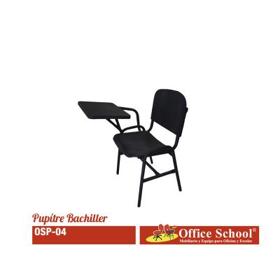 Pupitre Bachiller Metálico Asiento y Respaldo de Polipropileno, unidos a la estruc. c/8 remaches tipo pop de aluminio Ala ancha, Estruc. tubular redondo de 1¨ cal. 18, c/parrilla portalibros de varilla de 1/4, Paleta de lamina embutida cal. 22, termi
